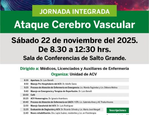 El próximo sábado 22 de noviembre, de 8.30 a 12.30 hrs. en la Sala de Conferencias de Salto Grande se realizará esta Jornada Integrada sobre Ataque Cerebro Vascular, organizada por la Unidad de ACV institucional con el apoyo de la Fundación Angels. Es una actividad dirigida a médicos, licenciados y auxiliares de enfermería. Por más…