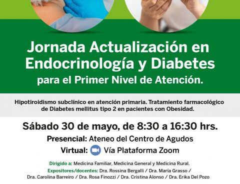 El sábado 30 de mayo, de 8:30 a 16:30 hrs. en el Ateneo del Centro de Agudos, se llevará a cabo la Jornada sobre Actualización en Endocrinología y Diabetes para el Primer Nivel de Atención y Tratamiento farmacológico de Diabetes mellitus tipo 2 en pacientes con Obesidad. Dirigido a: Medicina Familiar, Medicina General y Medicina…